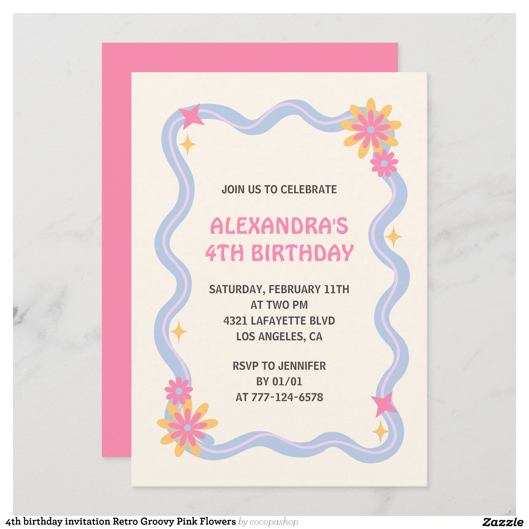Be the first to review “4th birthday invitation Retro Groovy Pink Flowers”