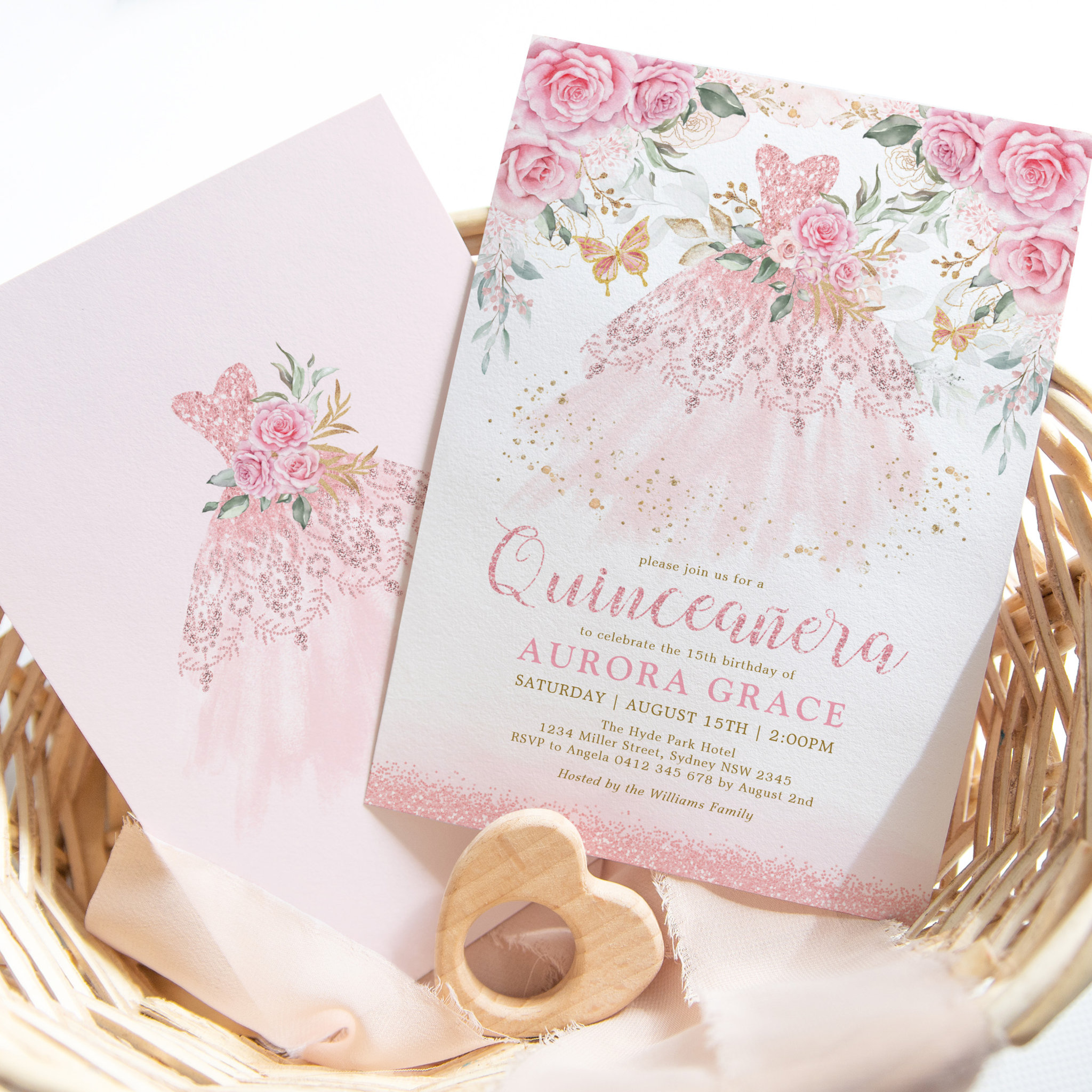 Beautiful Pink Roses Princess Dress Quincea?era Invitation