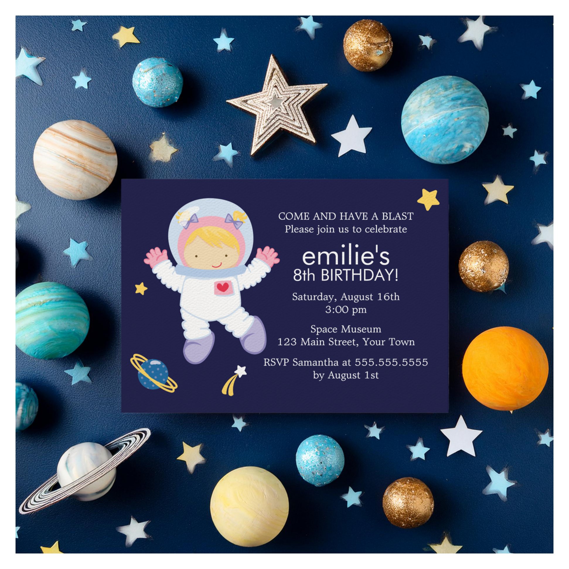 Girl Astronaut Outer Space Themed Birthday Invitation