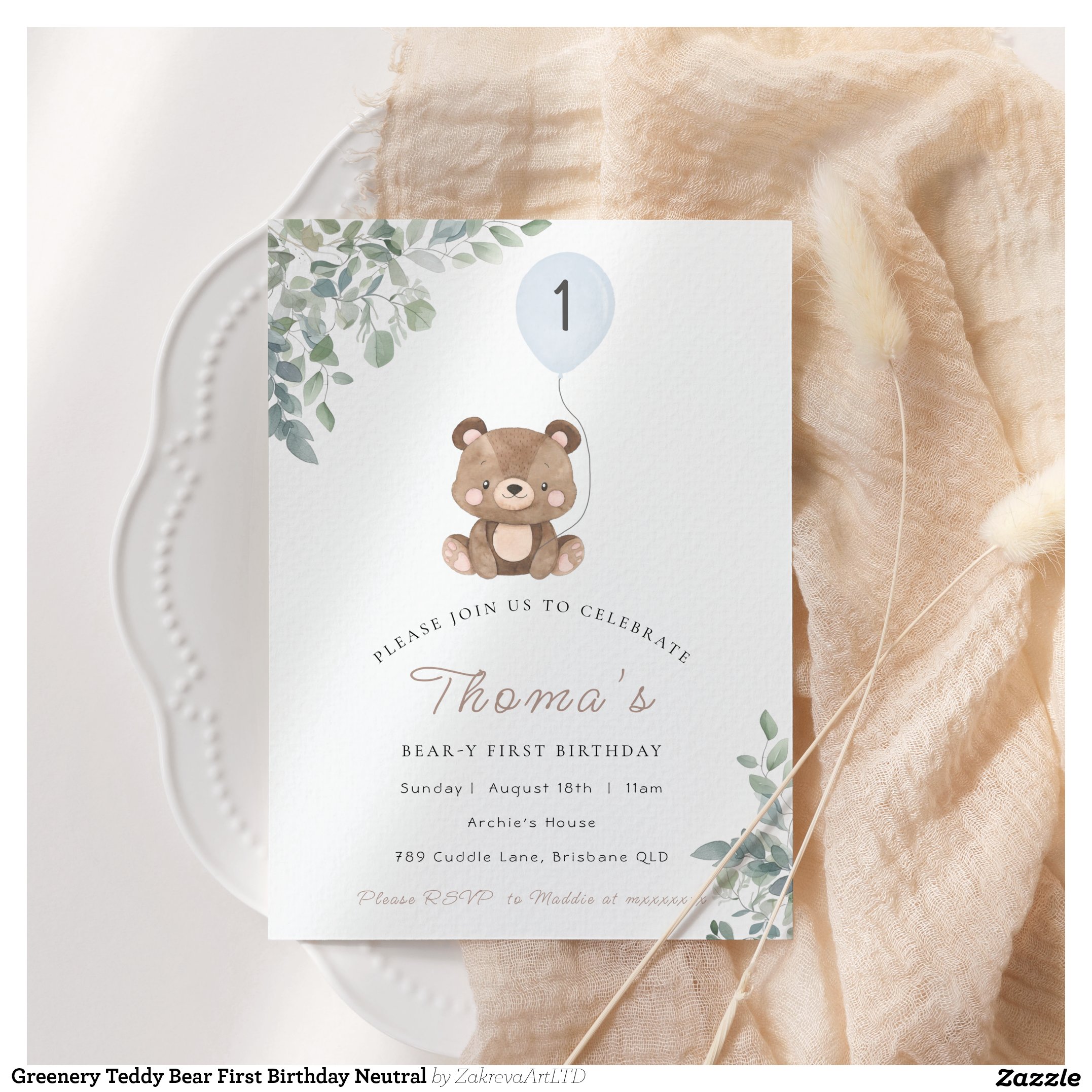 Greenery Teddy Bear First Birthday Neutral Invitation