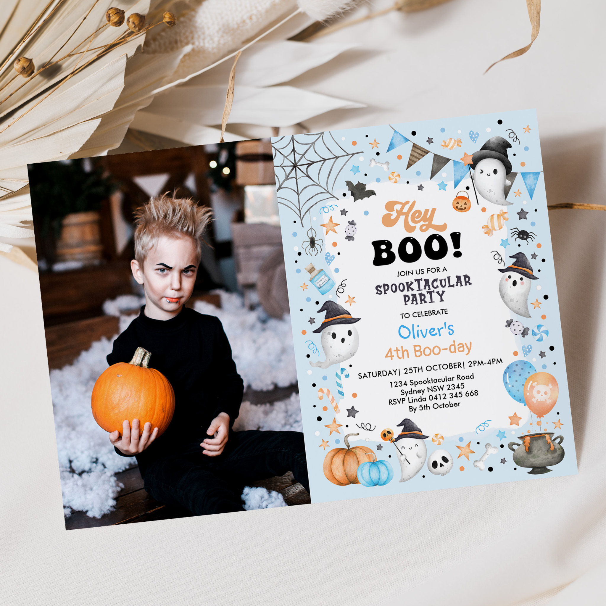 Hey Boo! Blue Halloween Ghost Boy Birthday Invitation