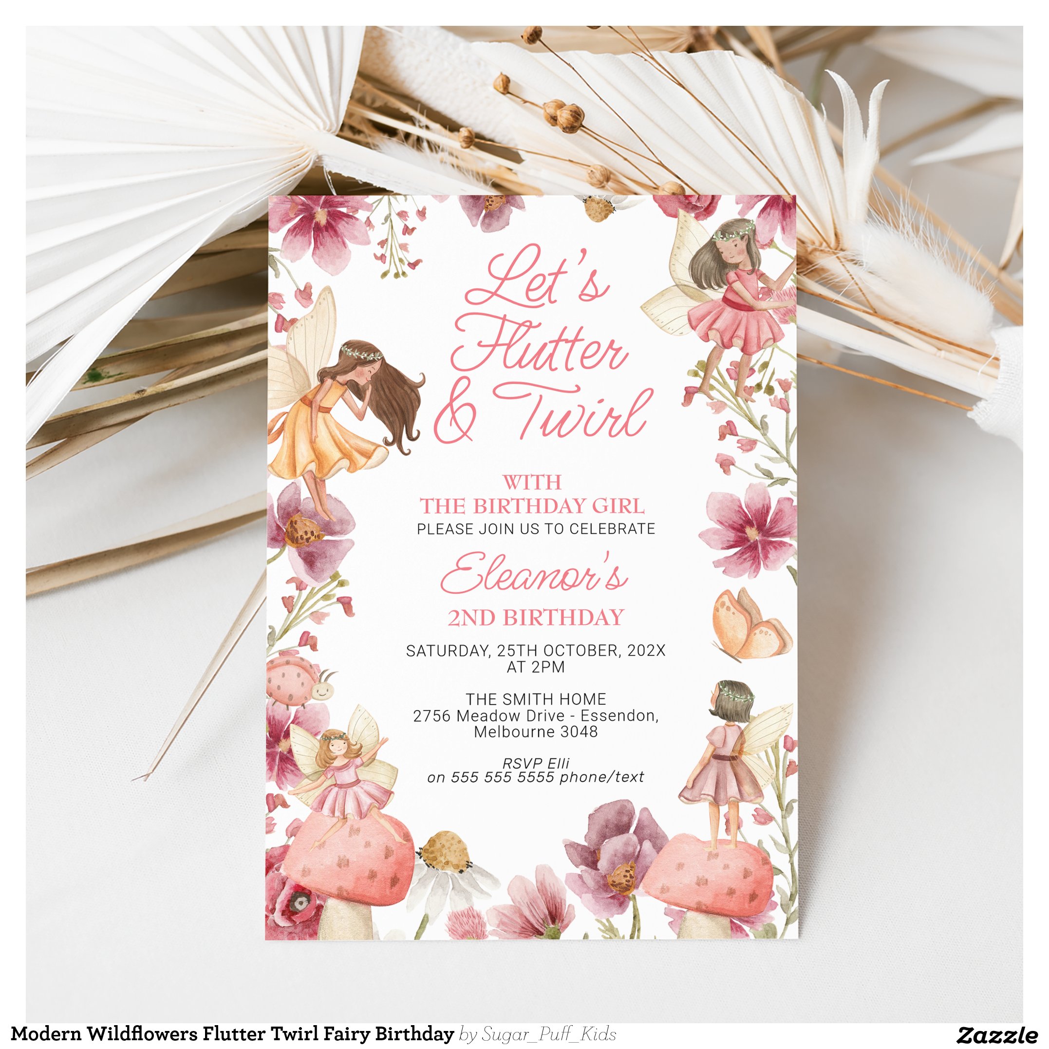 Modern Wildflowers Flutter Twirl Fairy Birthday Invitation