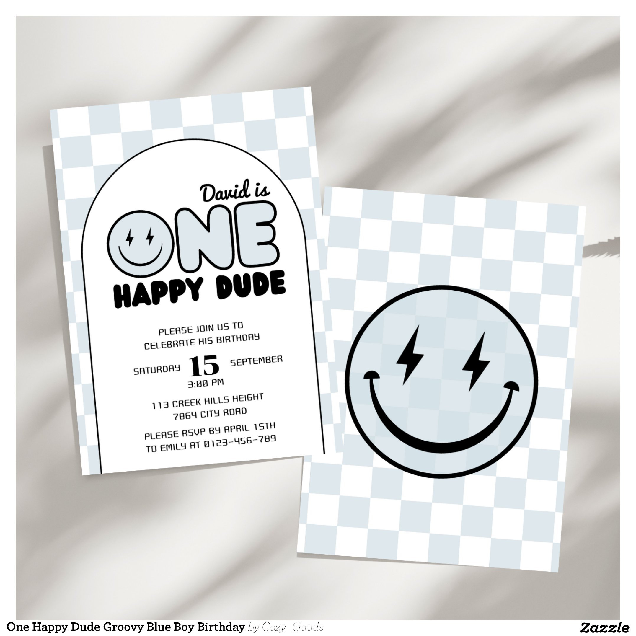 One Happy Dude Groovy Blue Boy Birthday Invitation