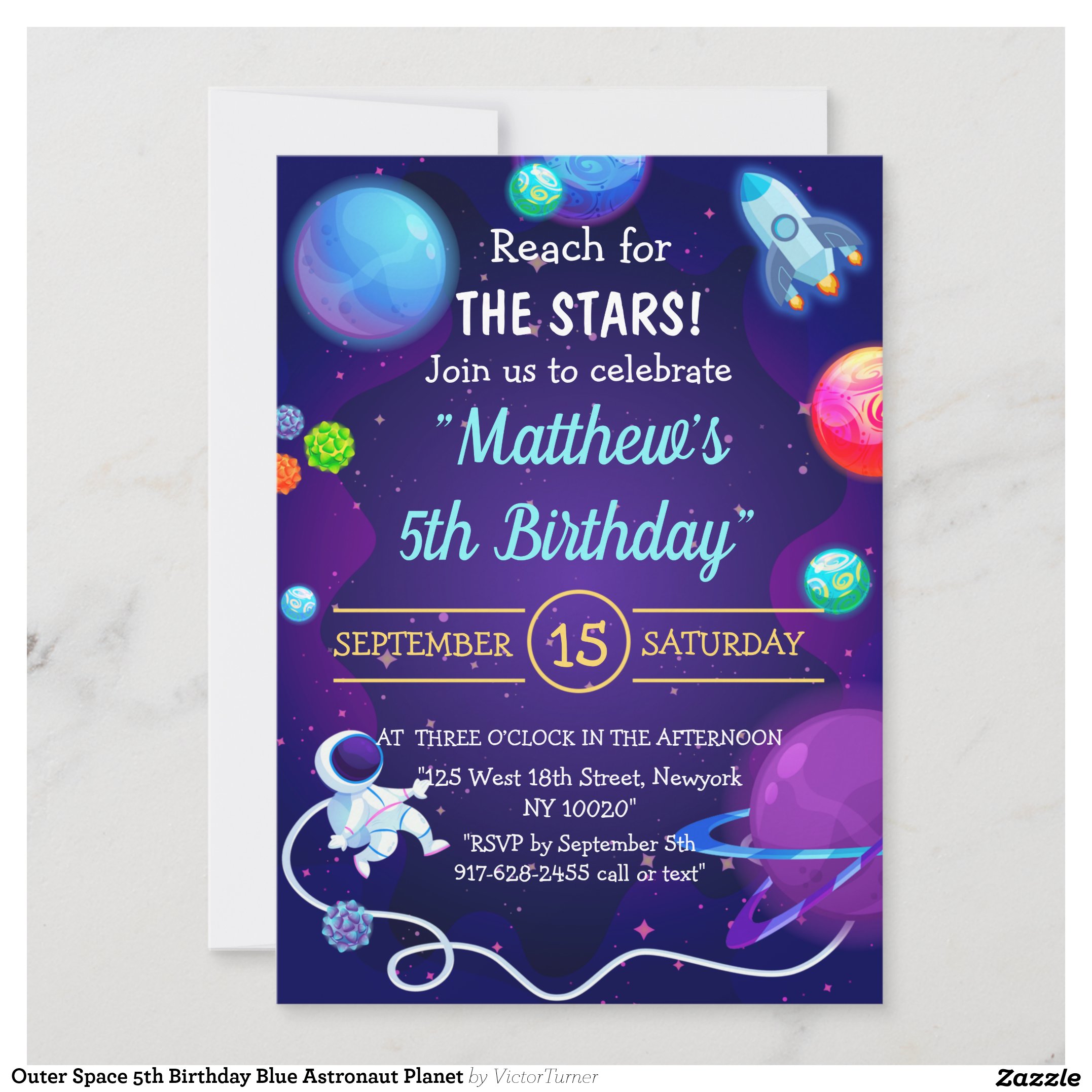 Outer Space 5th Birthday Blue Astronaut Planet Invitation