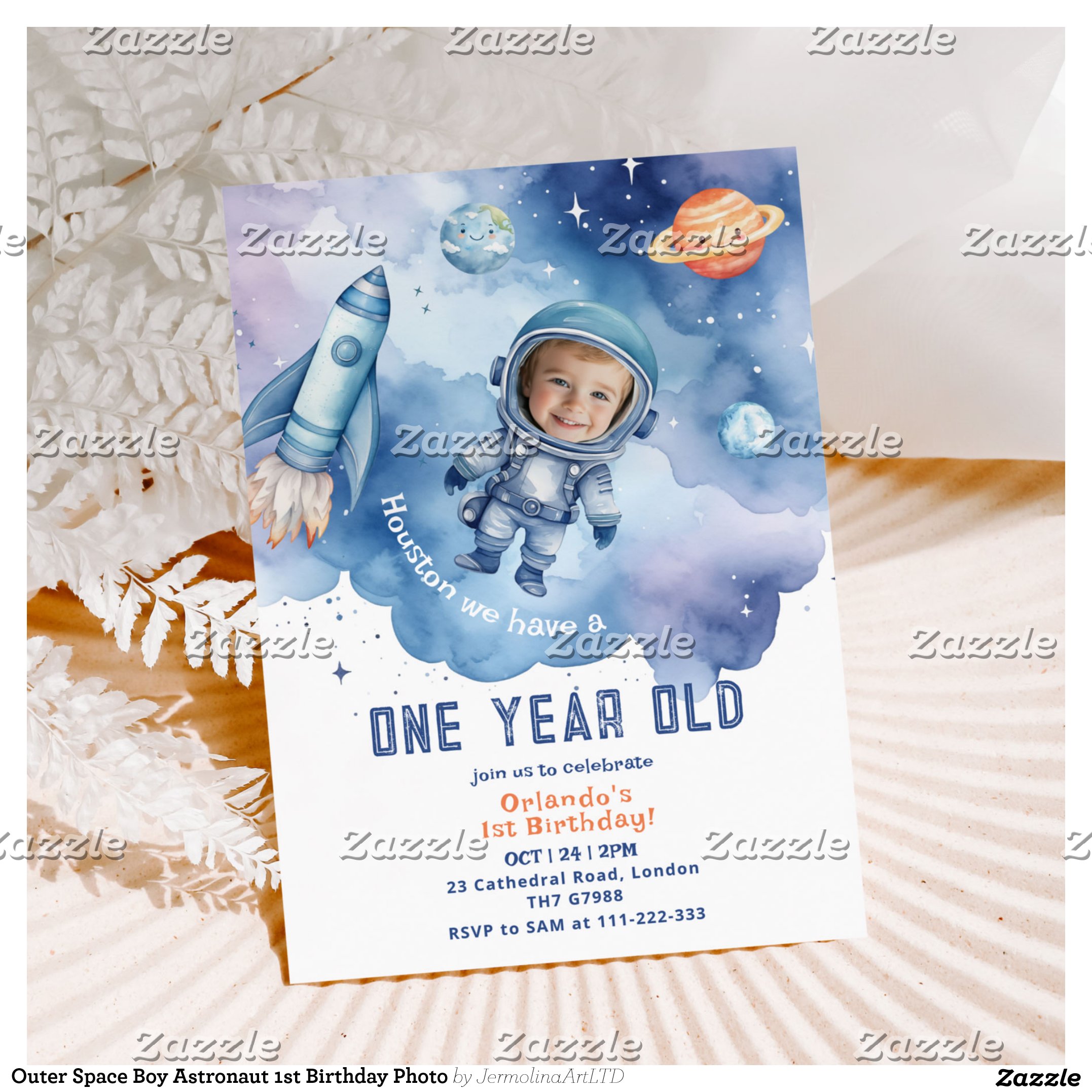 Outer Space Boy Astronaut 1st Birthday Photo Invitation