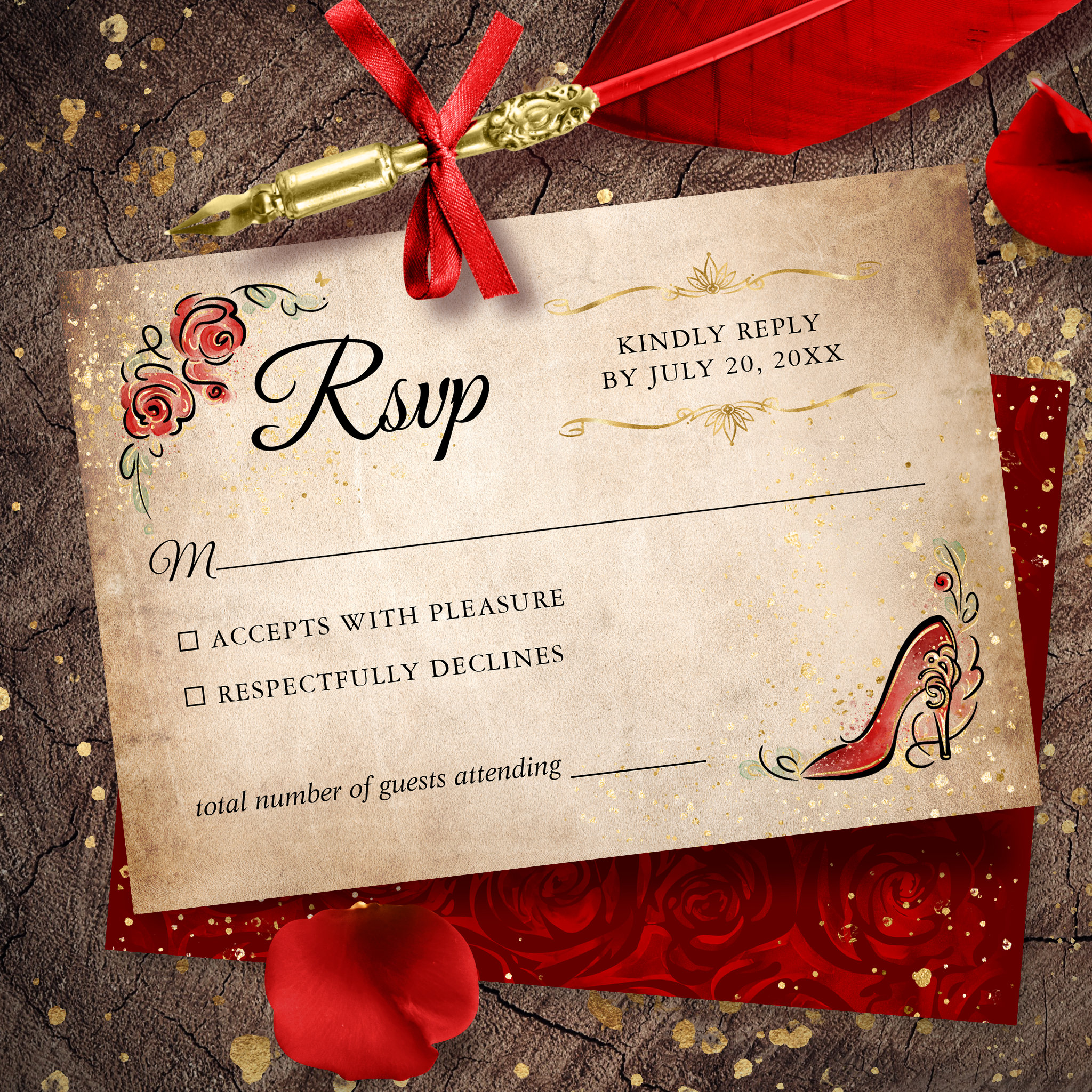 Be the first to review “Red and Gold Princess Elegant Wedding RSVP Card”