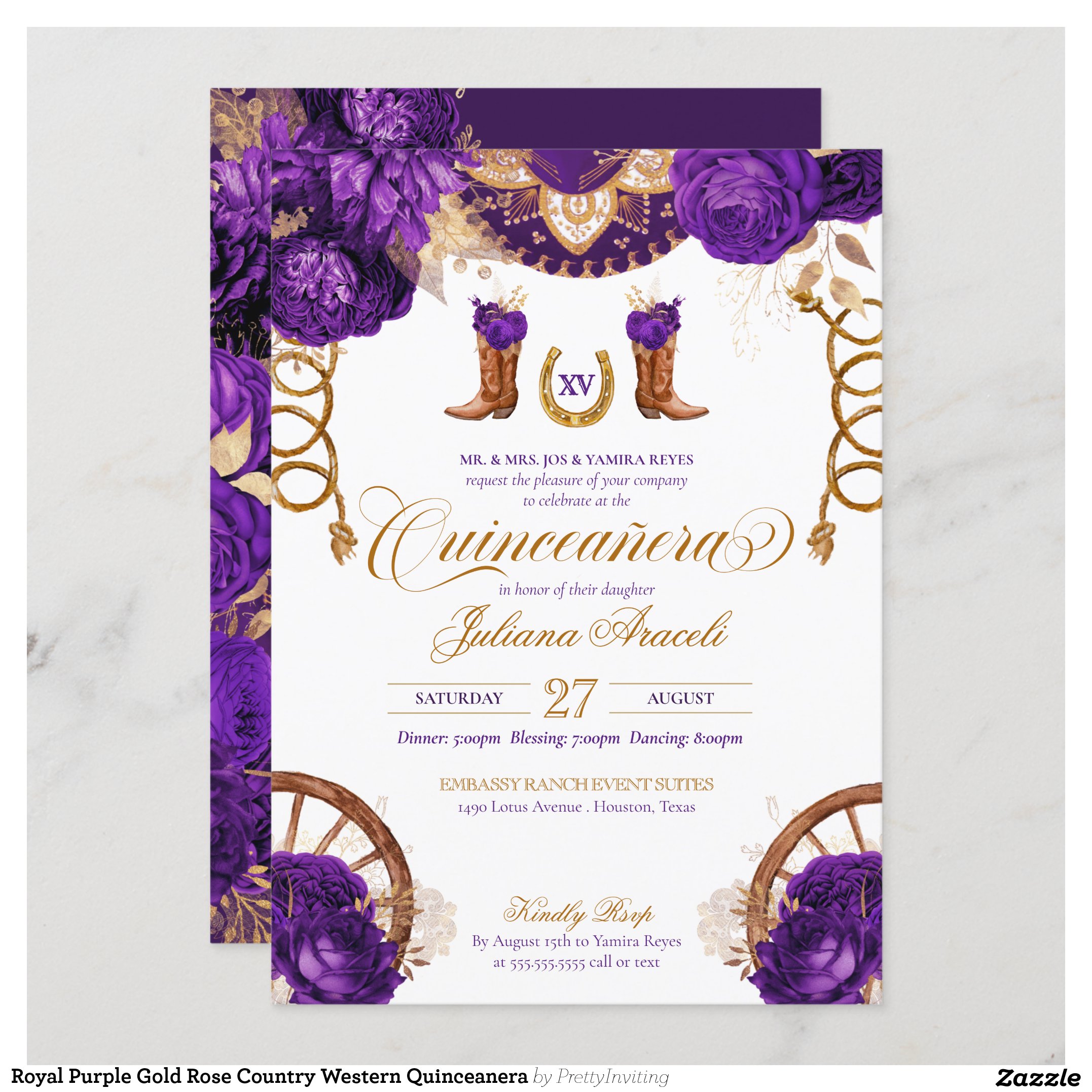 Be the first to review “Royal Purple Gold Rose Country Western Quinceanera Invitation”