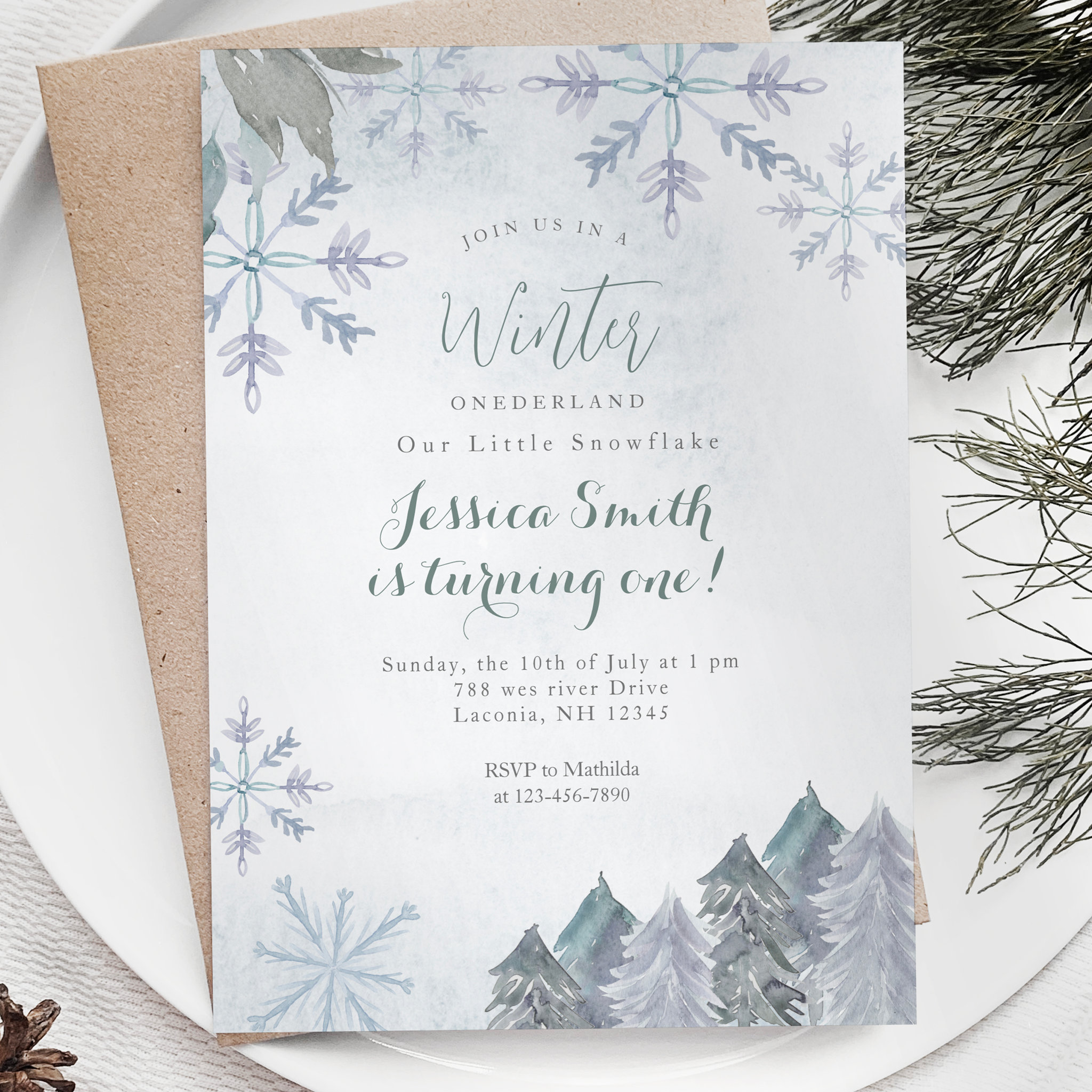Be the first to review “Snowflakes Misty Winter Onederland Birthday Invitation”