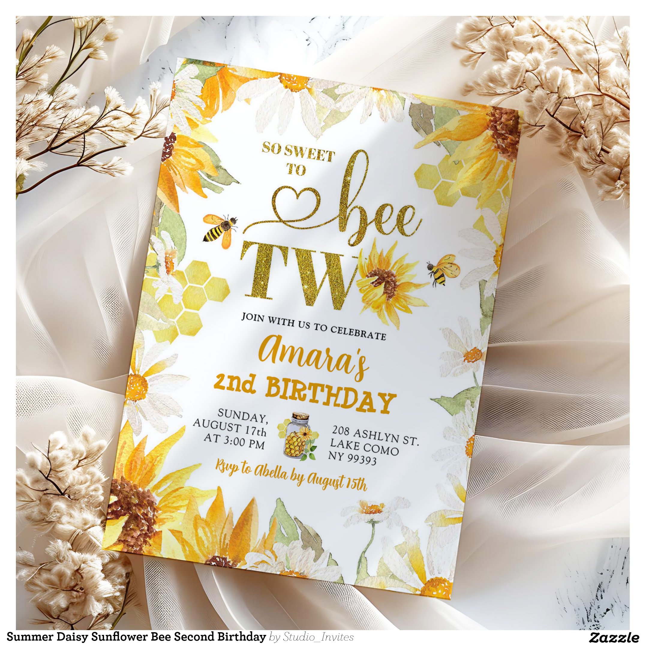 Summer Daisy Sunflower Bee Second Birthday Invitation