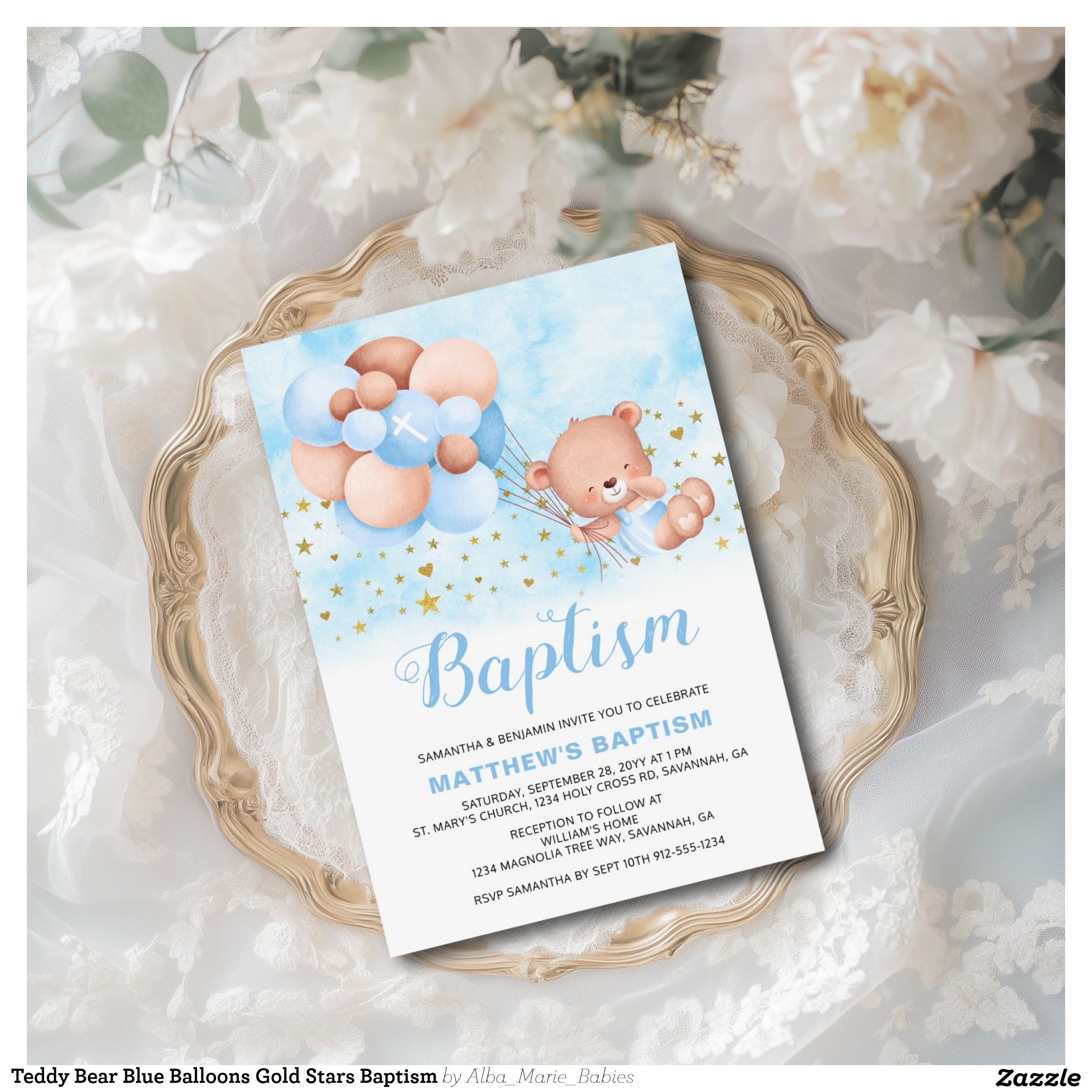 Teddy Bear Blue Balloons Gold Stars Baptism Invitation
