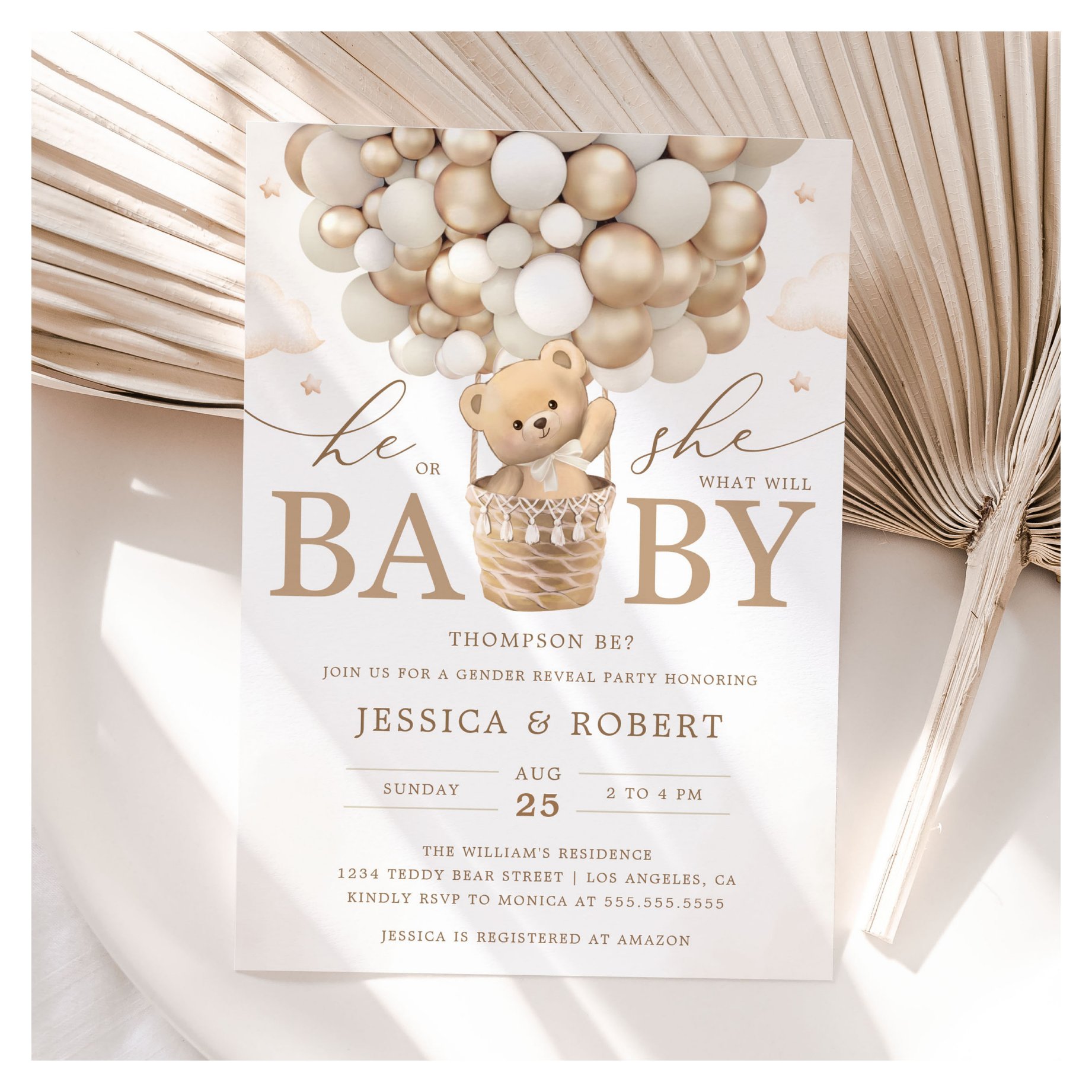 Teddy Bear with Neutral Balloons Gender Reveal Invitation