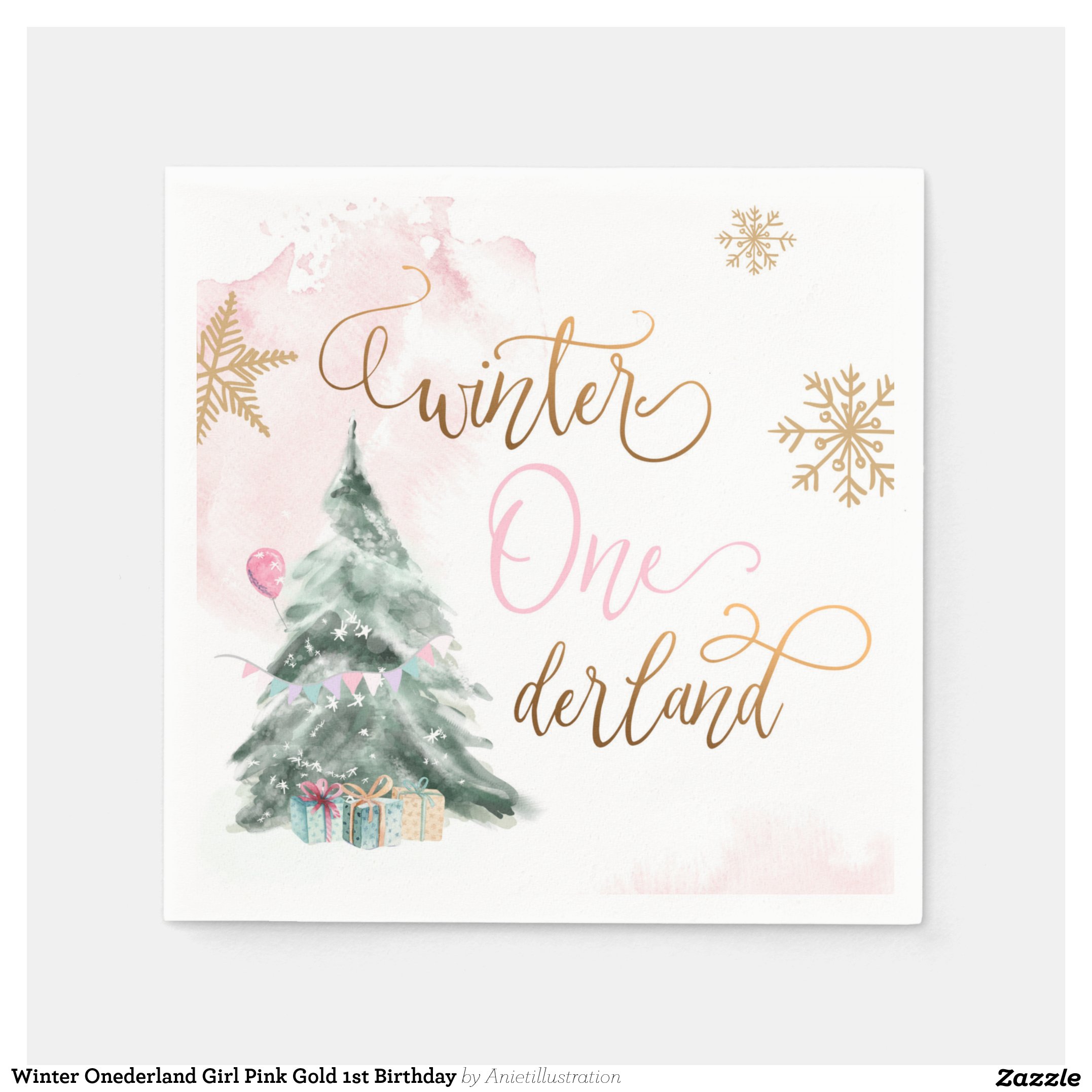 Winter Onederland Girl Pink Gold 1st Birthday Napkins