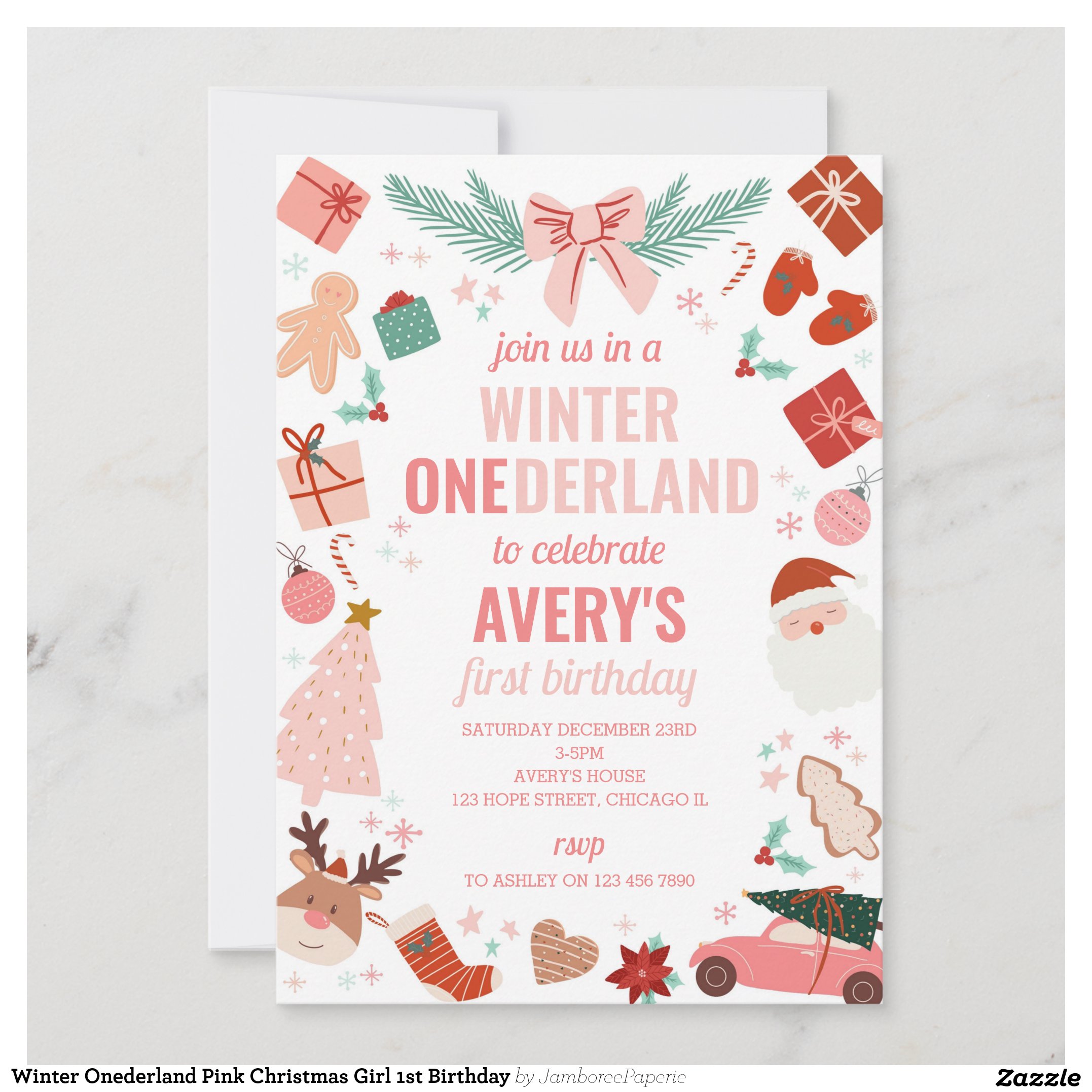 Winter Onederland Pink Christmas Girl 1st Birthday Invitation