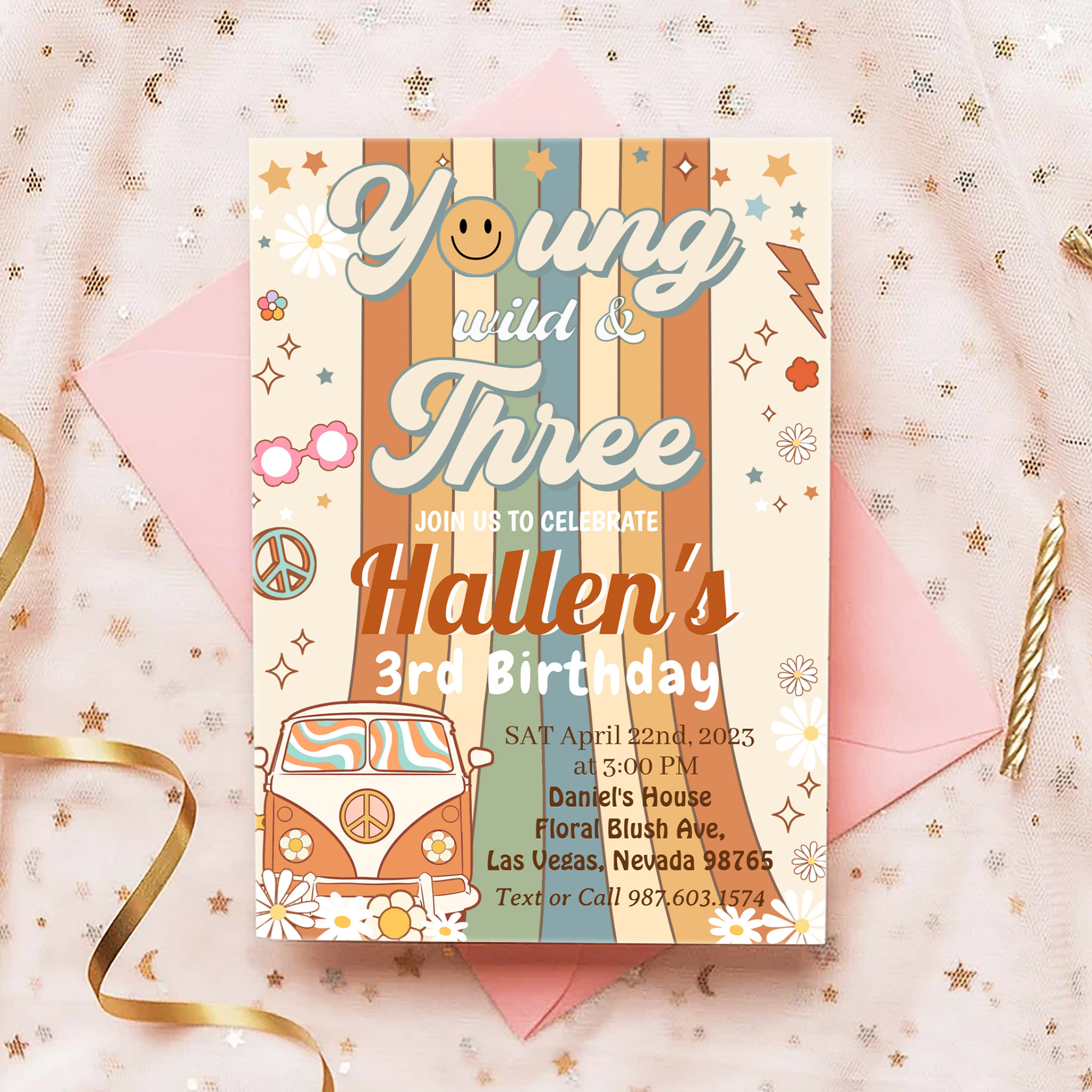 Young Wild & Three Groovy Rainbow 3rd Birthday Invitation